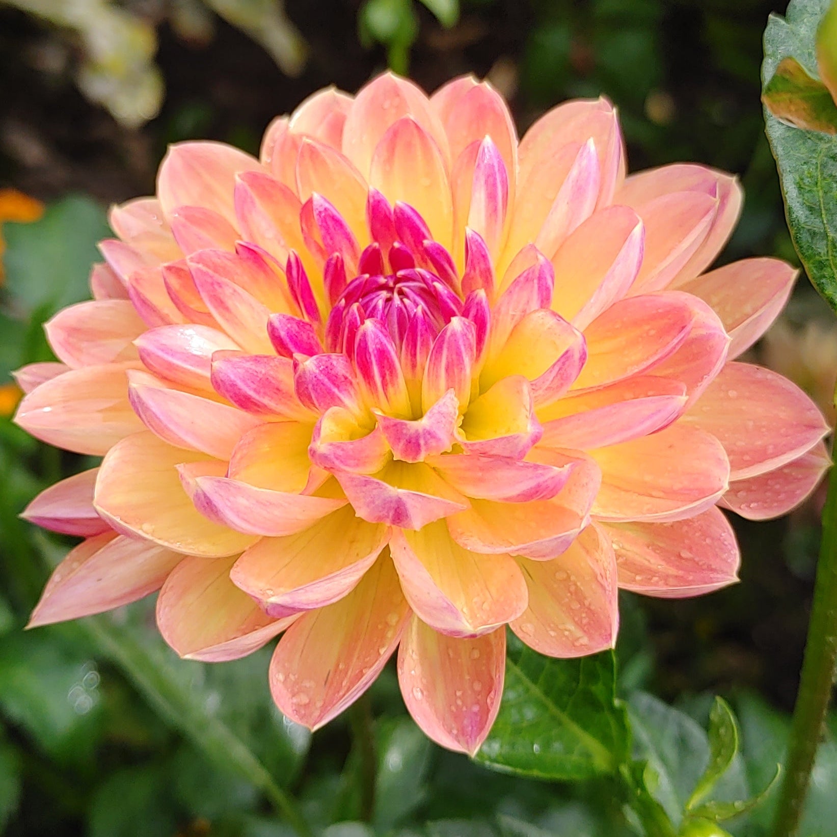 A dahlia in the waterlily form that wins at show. Pretty bronze color, undertones of peach. ~4' plant in our gardens.